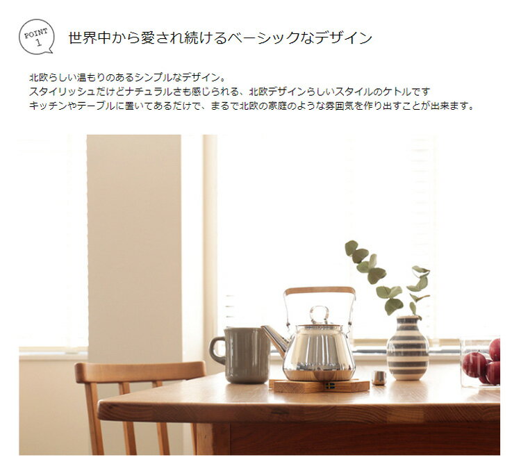 スタイリッシュだけどナチュラルさも感じられる、北欧デザインらしいスタイルのケトルです キッチンやテーブルに置いてあるだけで、まるで北欧の家庭のような雰囲気を作り出すことが出来ます。