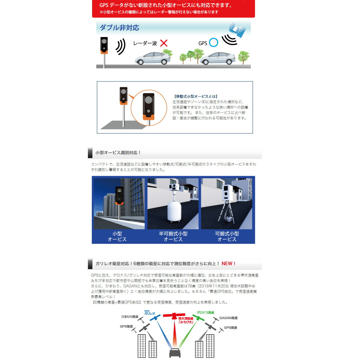 *レーダー波による取締りを行う小型オービスのみ ・小型オービスダブル対応 小型オービスの新取締周波数帯を受信可能!GPSデータによる警報に加え、レーダー波を受信して警報することも可能になりました。
