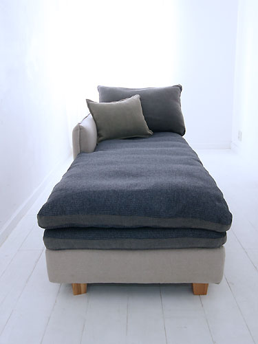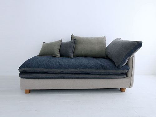広い座面でゆったりと、足をあげても寛げる実用性に加え、2重になった座面の座り心地にも注目! アームのない全面クッションの座面、深みのあるグレー、裏と表で生地を変えたバイカラー。