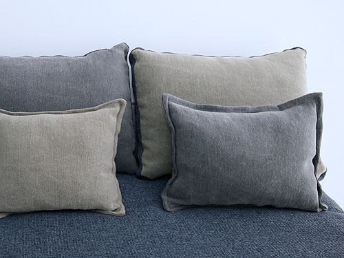バイカラーのソファに合わせた生地のクッションは、置くだけでソファメイキングが完成します。