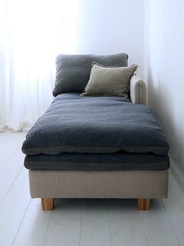 広い座面でゆったりと、足をあげても寛げる実用性に加え、2重になった座面の座り心地にも注目! アームのない全面クッションの座面、深みのあるグレー、裏と表で生地を変えたバイカラー。